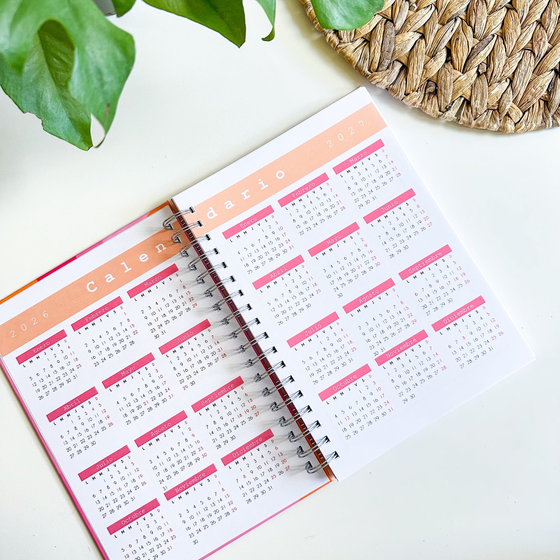 Incluye espacios pensados para acompañarte durante todo el año, con un diseño en tonos rosado y naranjos suaves, perfecto para una planificación clara y agradable.